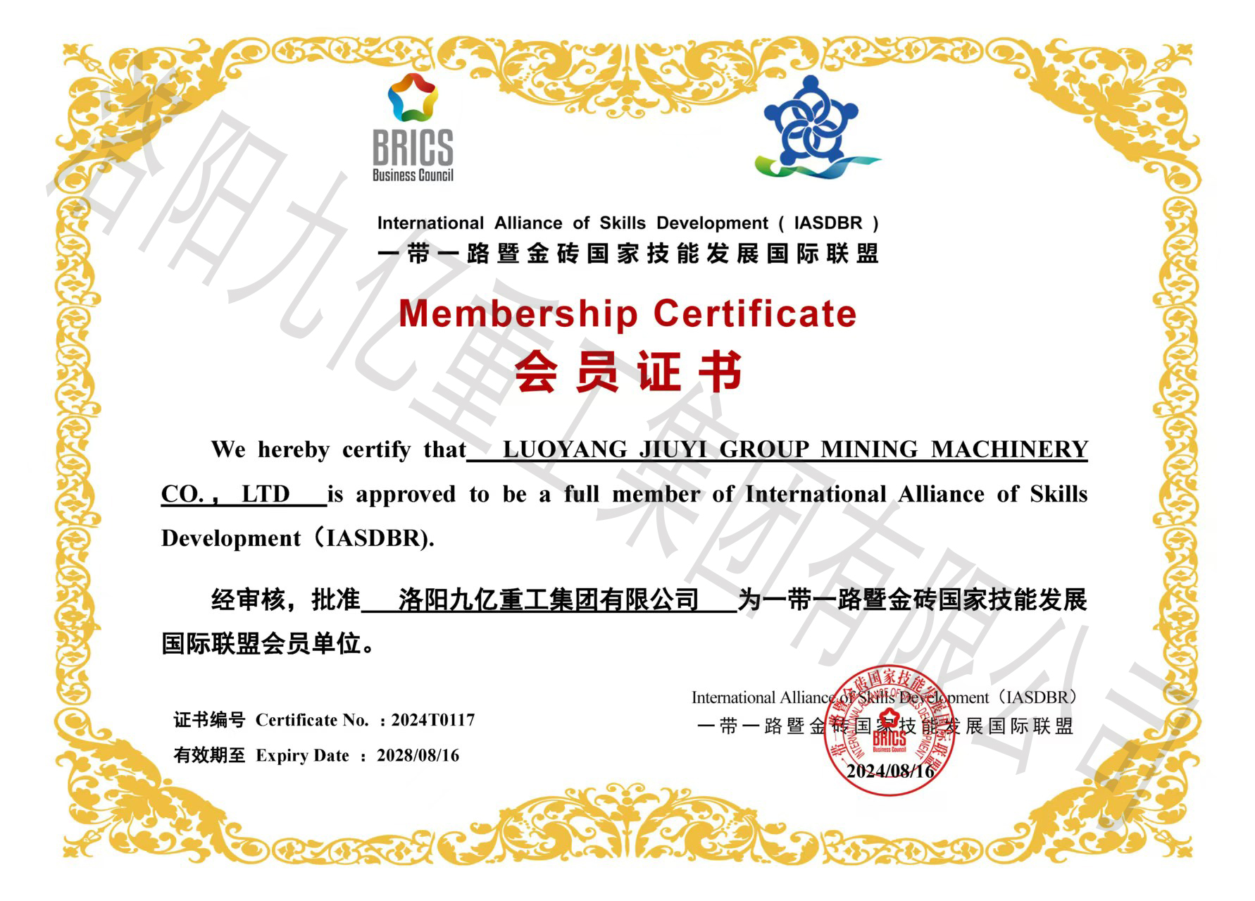 一带一路暨金砖国家技能发展国际联盟会员证书